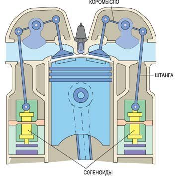 В ней вместо громоздких электромагнитов, установленных над клапанами, применены длинные соленоиды. Торможение сердечника в длинном соленоиде реализуется не жесткими упорами, а краевыми магнитными полями, и работа привода становится бесшумной. Кроме того, ход клапана может быть сколь угодно большим и регулируемым. Возвратно-поступательное движение от электромагнита к клапану передается через штангу и качающееся коромысло. Благодаря этому привод можно устанавливать не над блоком цилиндров, а на его боковой поверхности. В результате значительно уменьшается высота двигателя, а для охлаждения и смазки деталей привода используются штатные системы автомобиля.